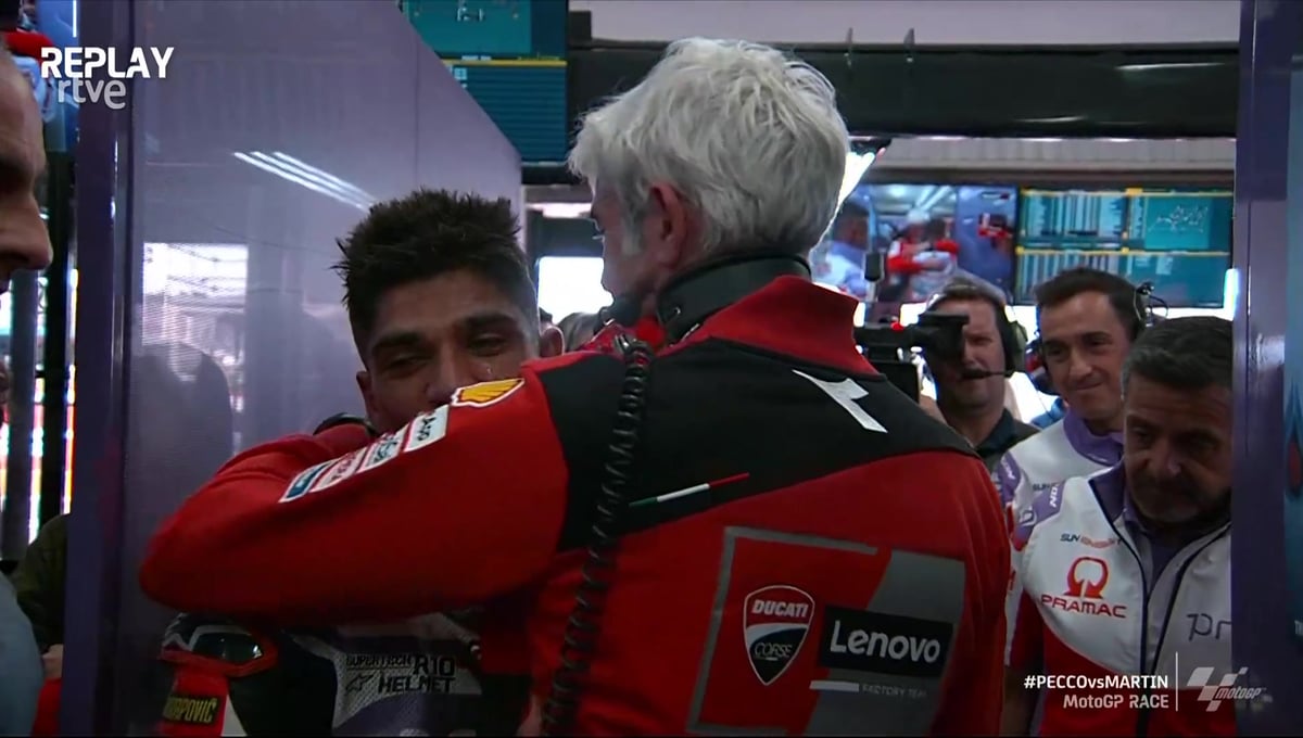 Gigi Dall'Igna, jefe de Ducati, consuela a un Jorge Martín derrumbado después de perder el Mundial.RTVE