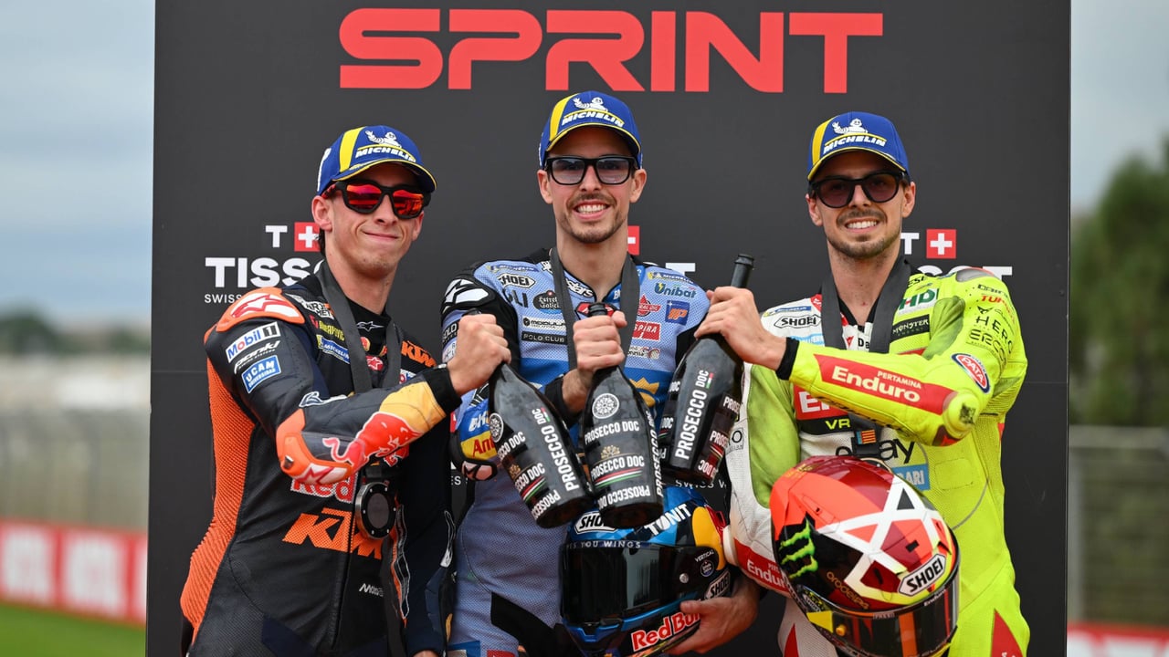 Pedro Acosta, Álex Márquez y Di Giannantonio, en el podio de la Sprint en Cheste.Cordon Press
