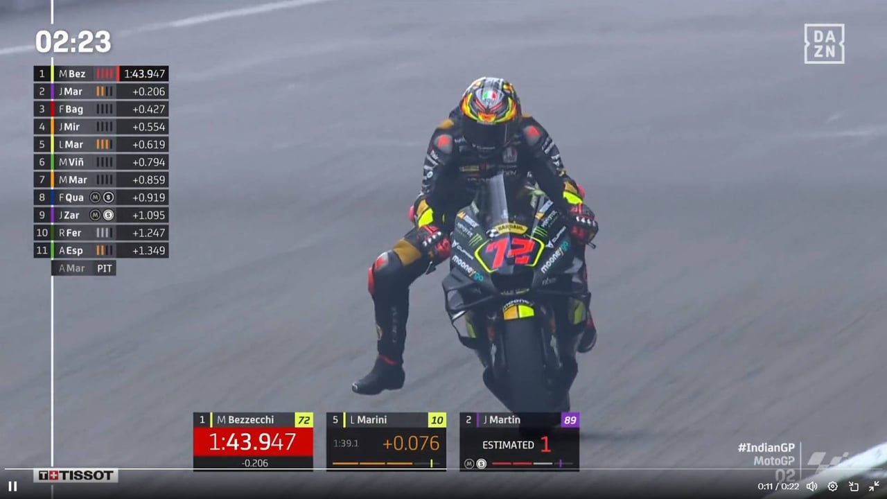 Tercera 'pole' de al temporada para el italiano, la primera en la historia del circuito de Buddh, en una gran actuación de Jorge Martín, que también rodó en 1:43 y tan sólo 43 milésimas lo separaron de Bezzechi; Ducati hace poker en cabeza: Bagnaia y Marini pasaron por delante de Mir (5º) y Márquez (6º)