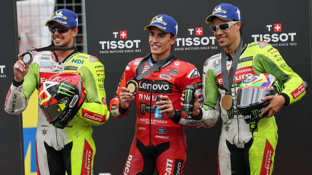 Marc Márquez, Fabio Di Giannantonio y FGranco Morbidelli en el podio de la carrera sprint del GP de Hungría 2025 de MotoGPCordon Press