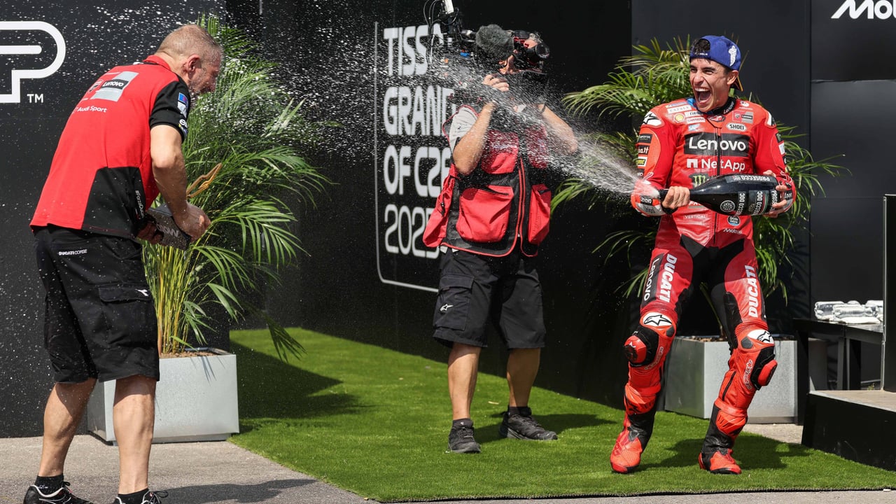 Marc Márquez celebrando con un miembro de Ducati su triunfo en el Gran Premio de la República Checa de MotoGP 2025 en BrnoCordon Press