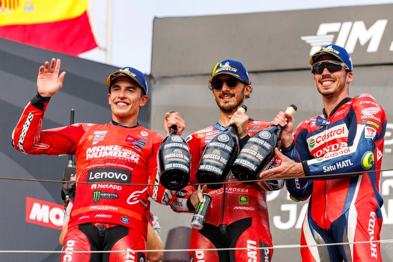 Pero si 2025 ha sido un año especial para la firma italiana no ha sido sólo por el papel que han hecho los hermanos Márquez, sino también por otros datos de los que han sacado pecho en sus medios oficiales. En total han conseguido 17 victorias (de 22) y 44 podios (de 66 posibles) en carrera larga, quedándose a dos del récord de 2024, cuando lograron un descomunal 19 de 20 (solamente Maverick Viñales pudo evitar el pleno, al vencer el domingo de Austin).