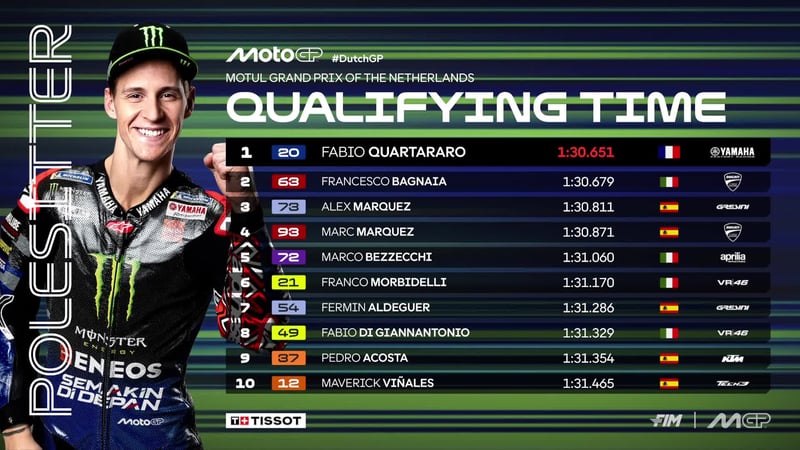 Quartararo ha logrado sacar partido a la Yamaha una vez más en una pista y en condiciones favorables, pero el francés es consciente de que defender la posición ante las Ducati será complicado. El galo ha sumado su cuarta pole, veremos a ver si consigue sacarle petróleo.