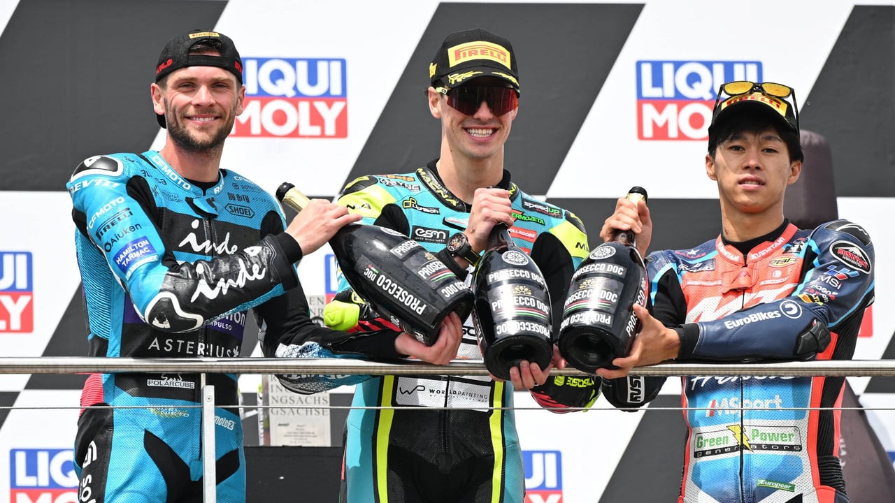 Fermín Aldeguer tras ganar una carrera de Moto2 a Jake Dixon y Ai OguraCordon Press
