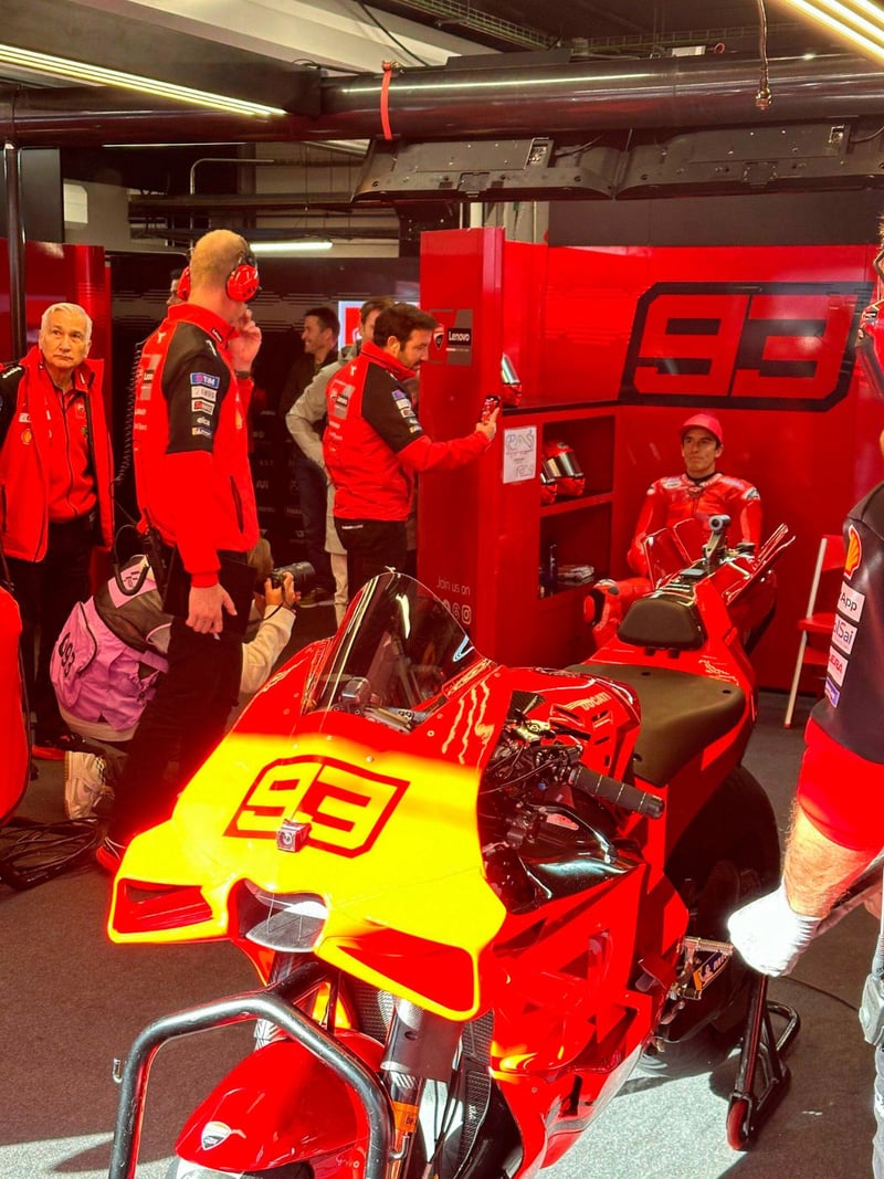 Ver a Mac Márquez de rojo ya levantó expectación, verlo en el garaje junto a los que serán sus nuevos jefes, con Tardozzi, Dall'Igna... El propio director general de Ducati Corse reconocía a media jornada que las primeras impresiones del piloto de Cervera eran muy buenas y que ya le había dicho que la GP25 era mucho mejor que la que él ha pilotado este año en Gresini Racing.