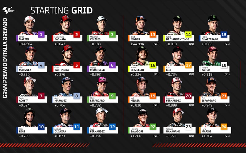 Jorge Martín le ha vuelto a ganar la partida a Pecco Bagnaia, esta vez en la clasificación, marcando el mejor tiempo de la historia en Mugello con un 1:44.504. Marc Márquez iba a por la pole, sin embargo sufrió una caída que le impidió mejorar su tiempo. Bagnaia finalmente acabó segundo y un sorprendente Maverick Viñales durante todo el fin de semana completó el podio de cara a la carrera de mañana en el trazado italiano.