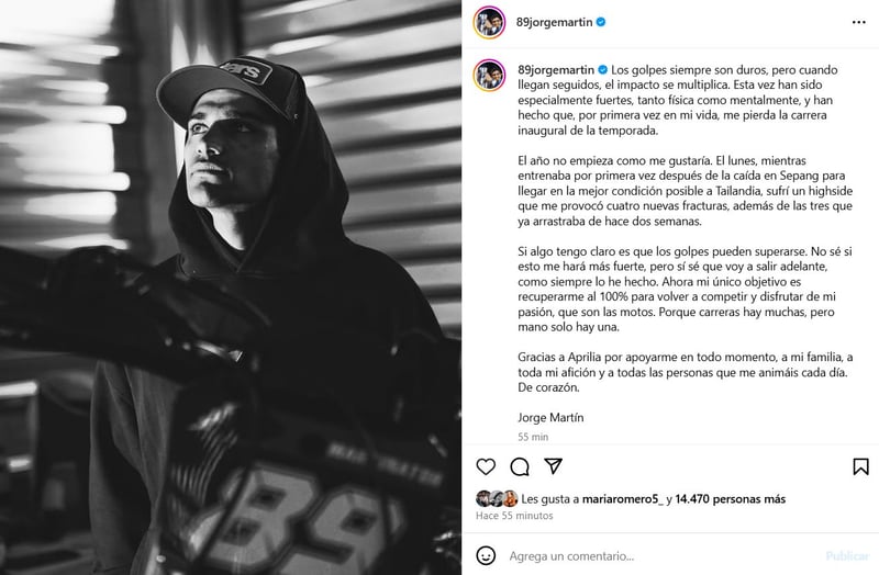 "Los golpes siempre son duros, pero cuando llegan seguidos, el impacto se multiplica. Esta vez han sido especialmente fuertes, tanto física como mentalmente, y han hecho que, por primera vez en mi vida, me pierda la carrera inaugural de la temporada. El año no empieza como me gustaría. El lunes, mientras entrenaba por primera vez después de la caída en Sepang para llegar en la mejor condición posible a Tailandia, sufrí un highside que me provocó cuatro nuevas fracturas, además de las tres que ya arrastraba de hace dos semanas.