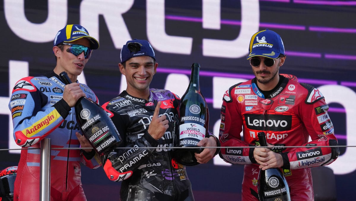 Jorge Martín, Marc Márquez y Pecco Bagnaia durante un podio de MotoGPCordon Press