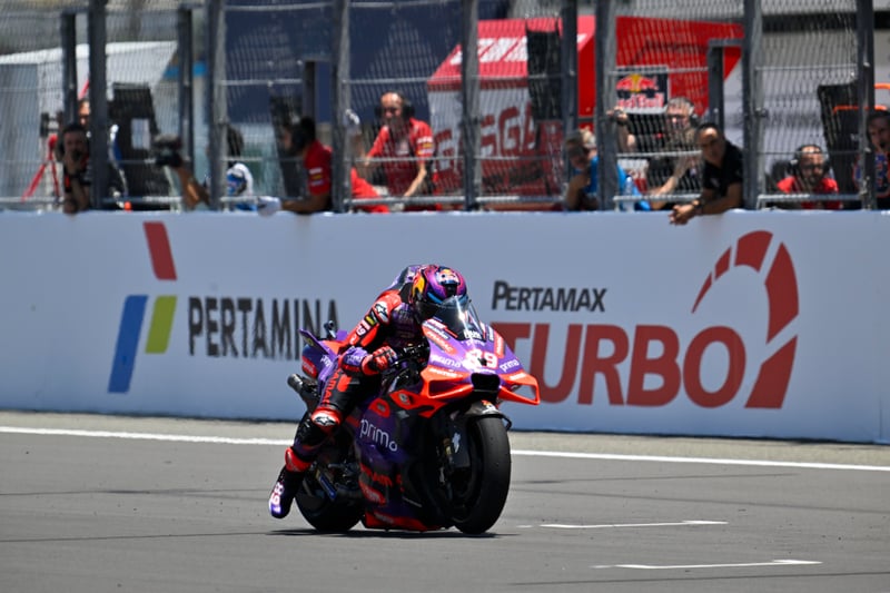 El inicio del Gran Premio de Indonesia de MotoGP ha dado una de cal y una de arena a Jorge Martín; por un lado, le ha ido muy bien en lo que se refiere a tiempo y ritmo, porque la moto ha corrido y ha conseguido clasificarse sin ningún problema para la Q2, a diferencia de su gran rival, Pecco Bagnaia, que ha tenido un día aciago hasta el último momento. Pero el del Pramac, pese a ser batido por Bastianini al final, ha salido contento. Sin embargo, se le ha visto muy contrario por un detalle que le puede perjudicar mucho el sábado y el domingo, las salidas.