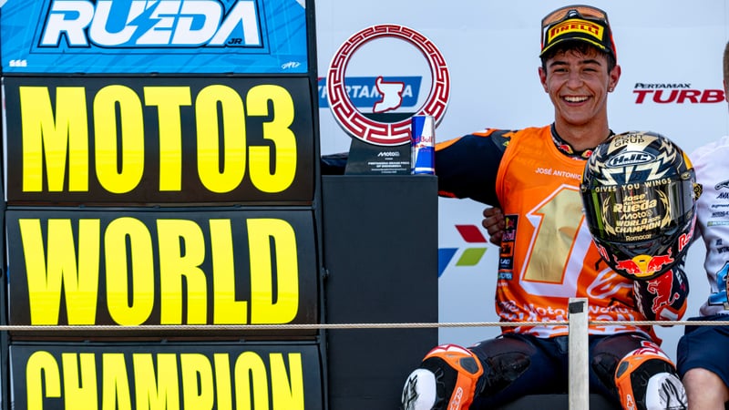 El motociclismo andaluz jamás había tenido un campeón del mundo hasta que hace una semana, José Antonio Rueda, un 'chaval' nacido hace apenas 19 años en Los Palacios y Villafranca, llevó a lo más alto la bandera blanca y verde. Desde que ascendiera a Moto3 en 2023 como uno de los grandes talentos de la década , el sevillano ha pasado por toda clase de problemas, hasta que en 2025, con una madurez impropia de alguien que no llega a la veintena (lo hará a finales de mes), ha arrasado para lograr este hito, antes de dar el salto a Moto2 en 2026.