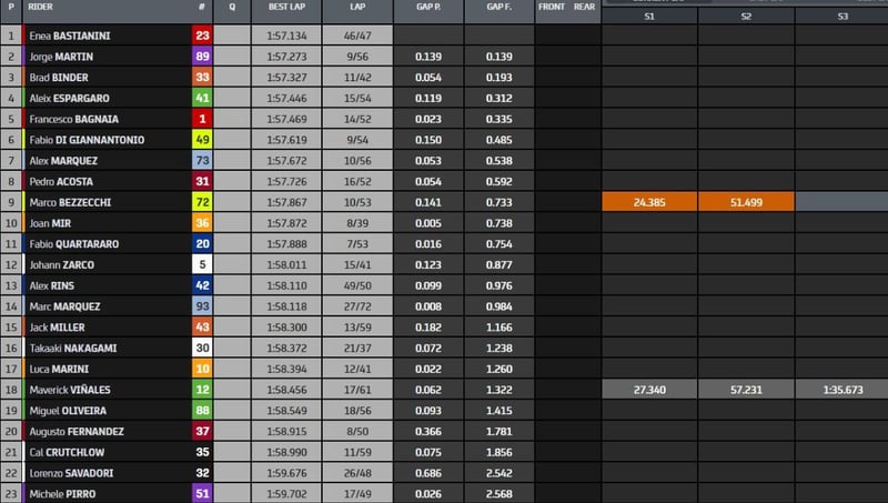 El equipo oficial de Ducati parecía 'picado' con ver a la Pramac de Martín en cabeza durante los dos días y fue el único que intentó mejorar los tiempos para acabar liderando la jornada. Bastianini lo logró con un tiempo de 1:57.134, pero a Pecco Bagnaia, pese a mejorar su tiempo de la mañana, sólo le dio para ser quinto.