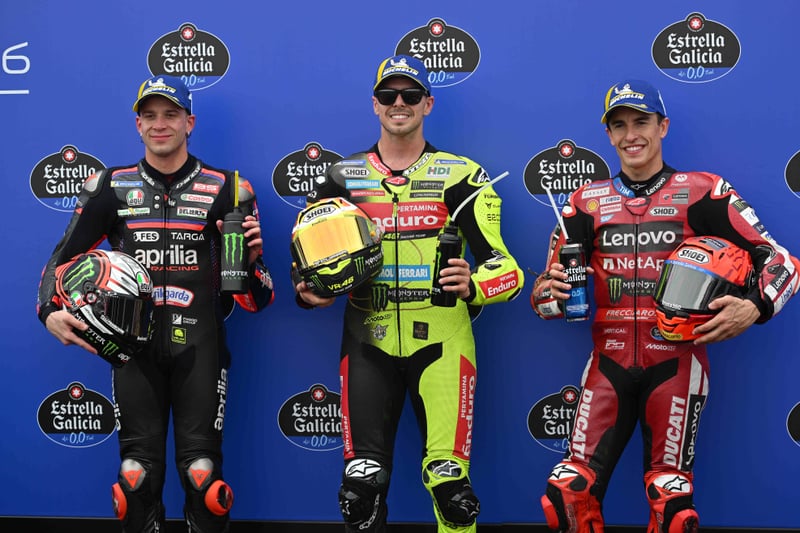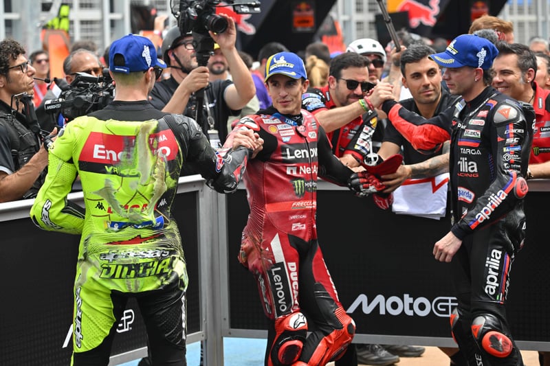 Que gran alegría para el deporte español. A pesar de que la pole fue para Fabio Di Giannantonio, Marc Márquez supo recortarle y arrebatarle una victoria que parecía anunciada. Aunque en la primera mitad de la carrera al sprint el italiano le llegó a sacar un segundo y medio, el catalán supo sacar provecho de posiblemente un error de Diggia y llevarse la carrera. Una 16ª victoria en Sprint que da que pensar que el vigente campeón de MotoGP ha vuelto a la lucha.