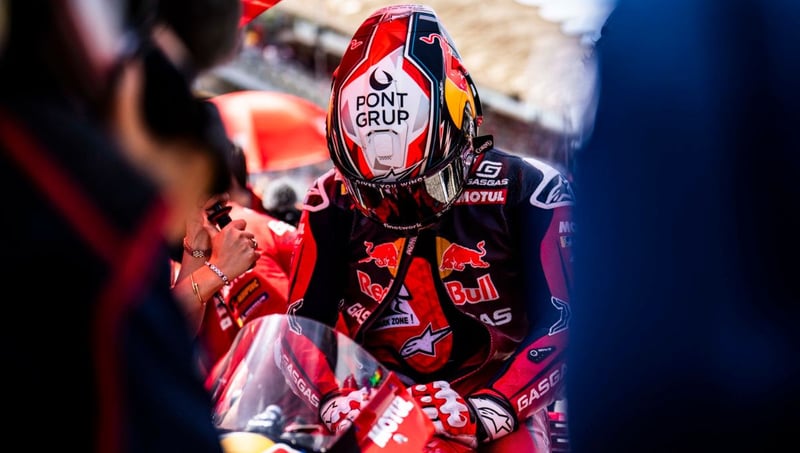 El piloto catalán lo intentó todo desde el principio en una lucha cerrada con Jorge Martín, con Pedro Acosta y con Pecco Bagnaia. Hizo un primer intento de liderar en el que se topó con la rueda de Pramac de Martín y, al segundo, lo logró. Pero, justo cuando estaba donde quería, a diez vueltas para el final, su moto se le deslizaba y se iba directamente a la grava.