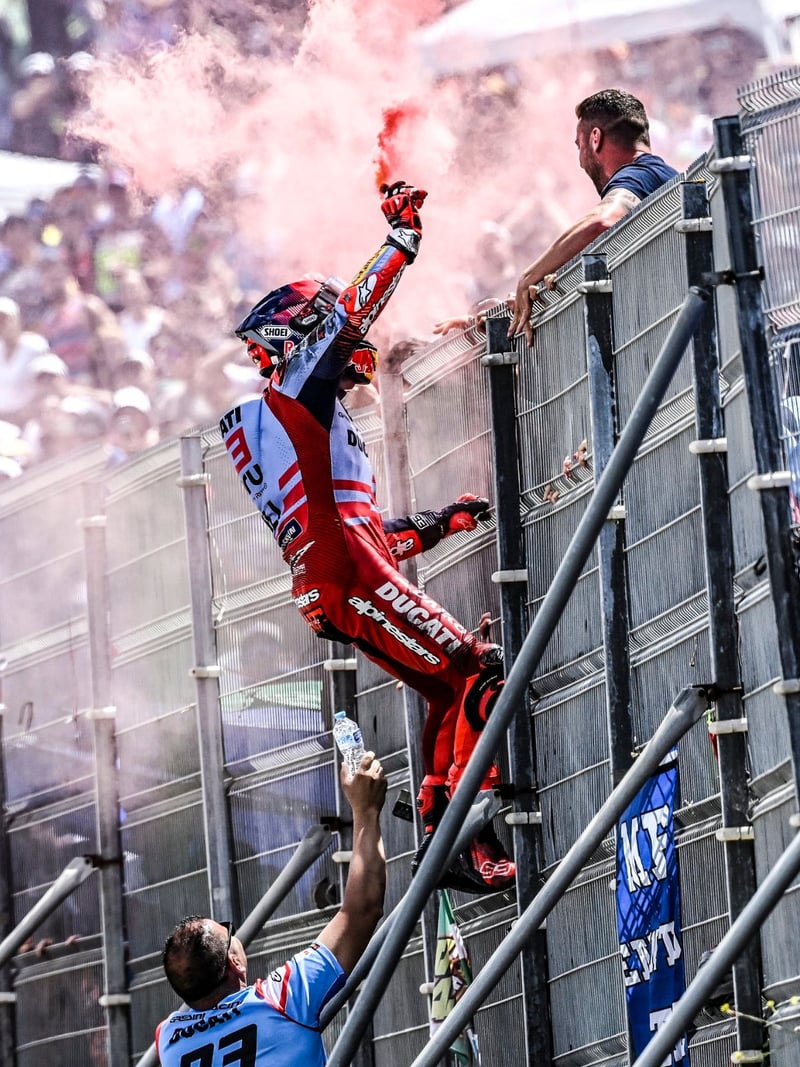 La tensión vivida en el box de Ducati, sobre todo tras lo visto dos carreras antes, cuando Marc Márquez y Pecco Bagnaia se tocaron y se fueron al suelo en Portimao, dio paso a la euforia. No sólo no había animadversión con Marc Márquez y con Gresini, sino que la cúpula de la escudería, encabezada por Gigi Dall'Igna y Davide Tardozzi, acudió a su box a felicitarlo.