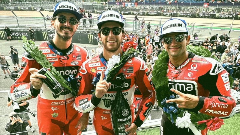 Bastianini sorprende en Silverstone con un triunfo espectacular en el Gran Premio de Inglaterra 2024, en el que Martín y Bagnaia fueron segundo y tercero