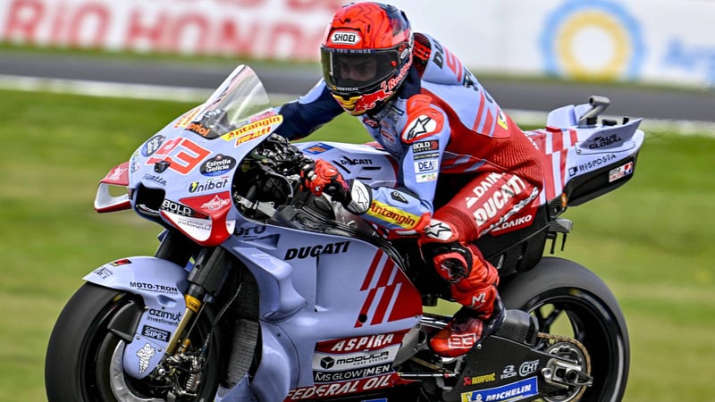 La carrera 'sprint' del Gran Premio de Australia de MotoGP disputada en el circuito de Phillip Island ha provocado 'microinfartos' de todos los colores. Un sinfín de caídas y, al final, un podio con dos pilotos españoles: Jorge Martín y Marc Márquez. Sin embargo, pese a su 'pole position', el madrileño sabe que tendrá que lidiar duramente mañana domingo con su compatriota.