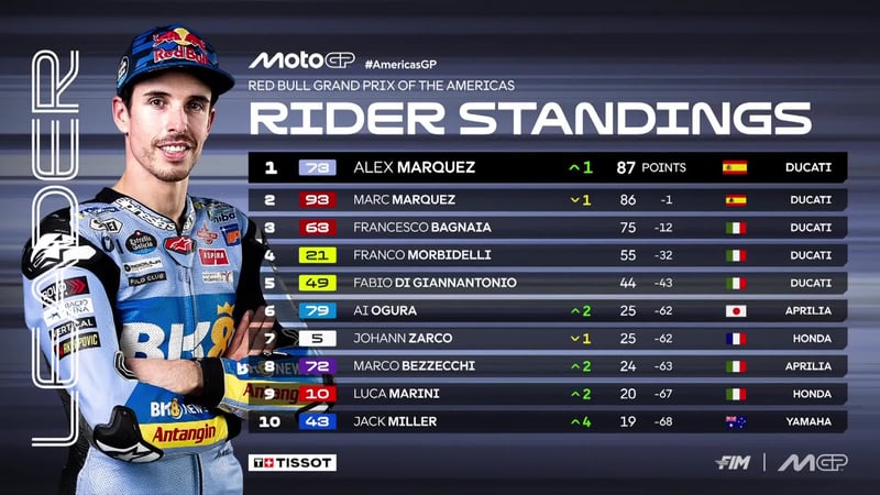 Y todo ello benefició a un Pecco Bagnaia al que se lo pusieron demasiado fácil para conquistar su primer victoria de la temporada y comenzar recortar distancias con los hermanos Márquez. Se anima el campeonato. El nuevo líder es Álex Márquez, quien terminó segundo y ya tiene un punto más que su hermano en la tabla.