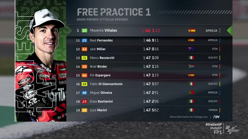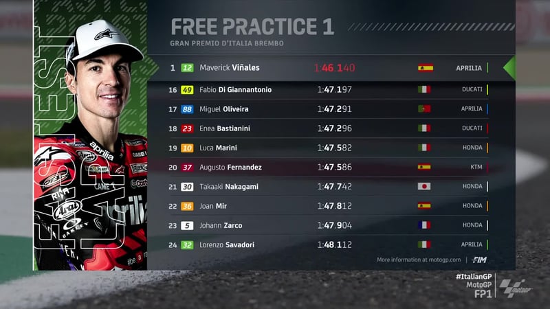 El Gran Premio de Italia dio comienzo hoy en una sesión de libres donde ha reinado la máxima igualdad. Ya en los primeros Libres de las categorías inferiores se veían tiempos muy parejos en todos los pilotos y en la categoría reina iba a seceder más de lo mismo. En Mugello, Maverick Viñales ha presentado su candidatura con su Aprilia liderando la primera sesión, le ha seguido Fabio Quartararo y Morbiddelli a escasas décimas. Contratiempos para Ducati en su casa, mientras Jorge Martín y Marc Márquez demuestran que la pelea por hacerse con el asiento oficial contiene su máxima igualdad tanto dentro como fuera de las pistas. Mismo tiempo clavado para ambos. Caída de Pedro Acosta que clava el cuarto mejor tiempo.