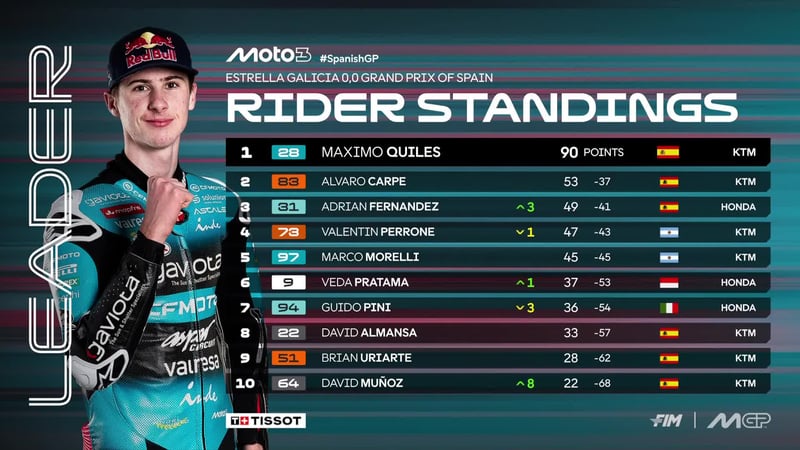 ¡Carrerón en Moto3! Tal y como acostumbra la categoría de bronce del mundial de motociclismo, la emoción se mantuvo de principio a fin salvo por la excepción de Máximo Quiles, un líder del Mundial que dejó clara su autoridad sobre el asfalto de Jerez. El murciano mantuvo la calma mientras pasaba vueltas en el grupo de cabeza y a tres del final dio el zarpazo definitivo para coronarse ganador del Gran Premio de España. No sorprende su felicidad tras cruzar la meta.