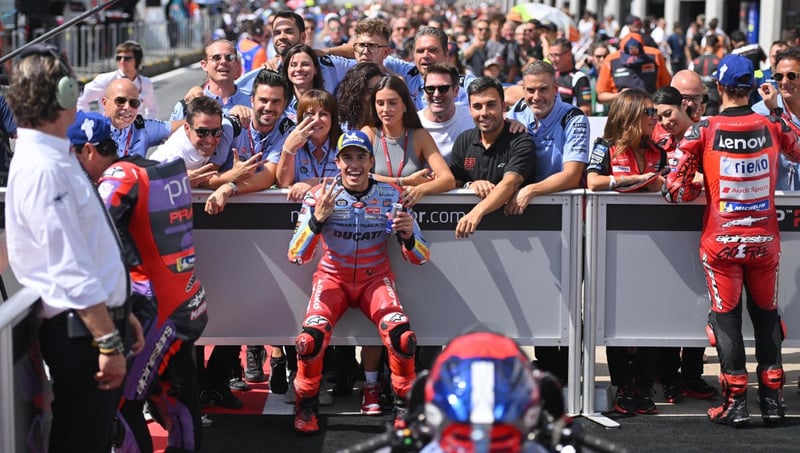 Ahí, la igualdad entre Pecco Bagnaia, Jorge Martín y Marc Márquez se mantuvo hasta la sanción al madrileño y la posterior caída del catalán, pero ambos estaban luchando por ser los mejores en línea de meta.