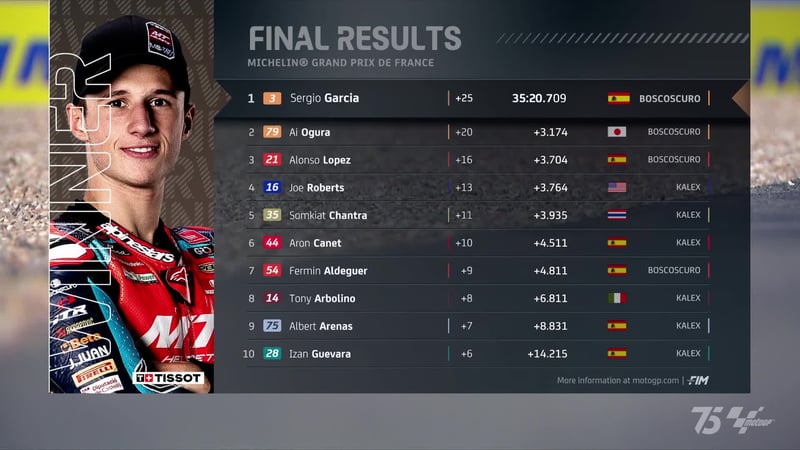 También ha acabado la carrera de Moto2, donde ha habido triunfo español y cambio de líder. Sergio García Dols se imponía en Le Mans tras dominar de principio a fin para, además, tomar el liderato del Mundial, con siete puntos de ventaja sobre Roberts y 26 respecto a Aldeguer y Ogura, que fue segundo.