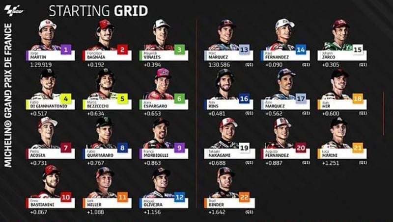 Recordamos que así quedó la parrilla de salida del Gran Premio de Francia 2024 de MotoGP; mandan las Ducati, pero las Aprilia siguen ahí...