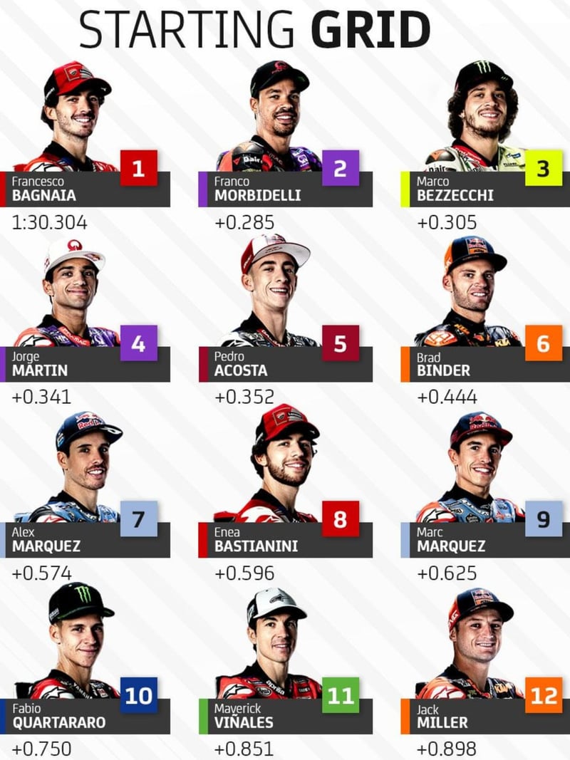 Avisados ya de lo que pueden dar, hoy vuelven a las mismas posiciones. Bagnaia, al primer puesto de la parrilla, Jorge Martín, a la segunda línea (4º) y Marc Márquez, a la tercera (9º), por lo que se prevé otro duelo apasionante en el que otros pilotos, como el sábado en el Sprint, serán decisivos. En un segundo plano aparece un Bastianini que tras acabar cuarto el sábado en Misano, coge a Márquez en la tercera posición del campeonato del mundo. Un Morbidelli que fue capaz de asegurar el podio pese a la presión de 'La Bestia'. O un Bezzecchi que no tuvo su mejor día en el Sprint y acabó por los suelos. Y también están las KTM, que ya demostraron el sábado que van muy bien este fin de semana.