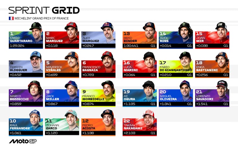 Y lo primero que hacemos es repasar la parrilla de salida. El francés saldrá por delante de los hermanos Márquez. Fermín Aldeguer es la gran sorpresa y Pedro Acosta lo tendrá muy complicado para puntuar.