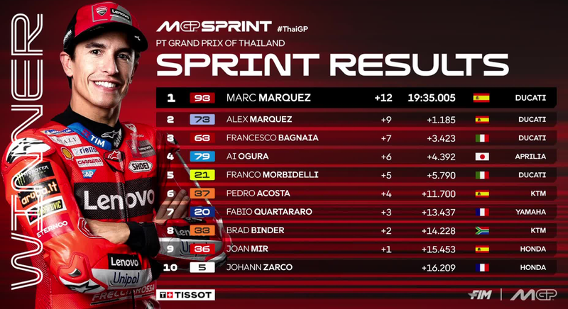 Y este es el resultado del Sprint, donde Marc Márquez logró la victoria, seguido por su hermano Álex Márquez y Pecco Bagnaia.