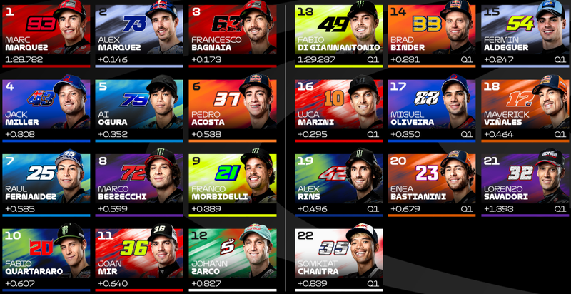 El italiano no tuvo su mejor sábado, ya que tuvo que pasar por la Q1 después de que sus tres mejores vueltas del viernes fueran anuladas por bandera amarilla. La última de estas anulaciones fue causada por un error humano que le impidió presentar una reclamación. Tras realizar una buena vuelta en la Q1, el piloto de Ducati regresó al box con la confianza de que podría entrar en la Q2 y tener más opciones de pelear por la pole con su compañero de equipo. No obstante, no contaba con que Marc había regresado a su mejor nivel y no tuvo problemas para colocarse en la primera posición. Al final, Pecco tuvo que conformarse con el tercer puesto, quedando detrás de Álex Márquez, quien también monta una Ducati GP24 y sueña con lograr grandes cosas en este mundial.