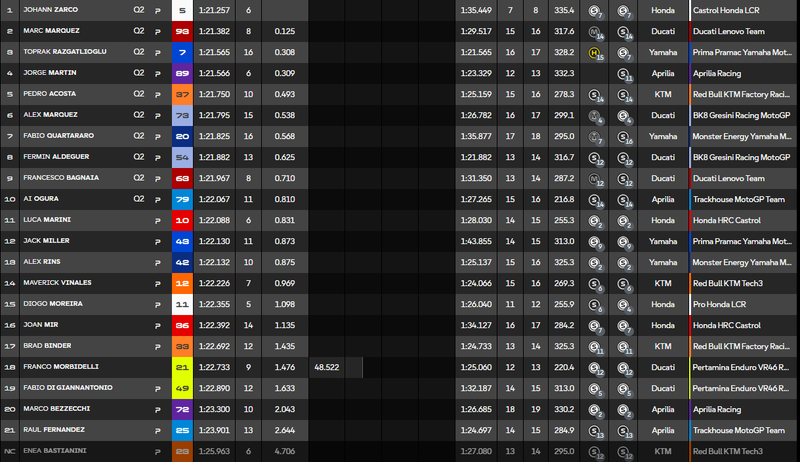 Johann Zarco fue el que dio la sorpresa de la jornada siendo el único que a última hora montó los neumáticos de seco y bajó el tiempo hasta un más que válido 1.21.257. El tercer clasificado fue Toprak Razgatlioglu, que ha conseguido su primer pase a Q2 desde que está en MotoGP. A este le siguió el trío de españoles, siendo la Aprilia de Jorge Martín la cuarta clasificada, quinta la moto de Pedro Acosta y sexto de Álex Marquez.