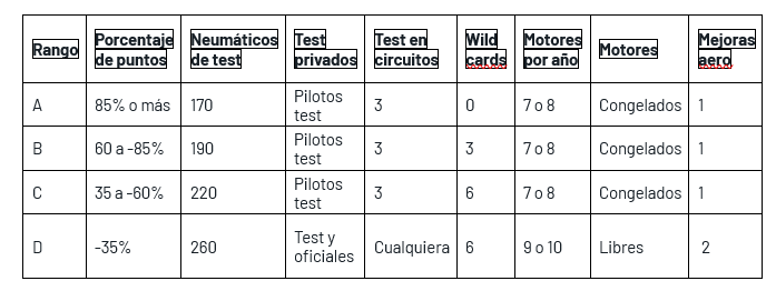 El nuevo reglamento de concesiones entrará en vigor a partir de 2027. Todos los fabricantes empezarán la temporada en el rango B e irán ascendiendo o descendiendo en función vaya transcurriendo la temporada.
