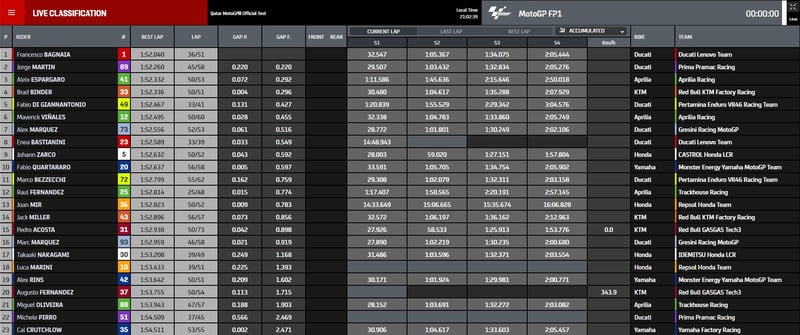 Los que sin duda fueron los dos grandes protagonistas del final de la temporada 2023 volvieron a erigirse en protagonistas en este inicio de 2024, marcando los mejores tiempos de la categoría después de completar un ímprobo trabajo a lo largo de toda la jornada, en la que Bagnaia marcó un mejor tiempo de 1:52.040 y Martín se quedó a 220 milésimas de segundo.
