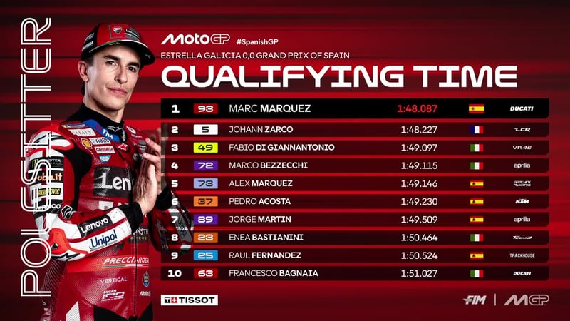 Lo cierto es que si hablamos de discutir con Marc ese primer lugar de salida el único que estuvo a la altura fue el veterano Johann Zarco. El galo bailó sobre un recorrido muy complicado para batir por momentos al vigente campeón mundial y ver cómo seguidamente este le pagaba con la misma moneda. Tuvo una última oportunidad, pero en la curva final perdió el control de la moto y se tuvo que conformar el segundo lugar (1:48:227). Alex Márquez concluyó quinto, Pedro Acosta sexto y Jorge Martín séptimo. El líder del mundial, Marco Bezzecchi, se tuvo que conformar con el cuarto lugar.