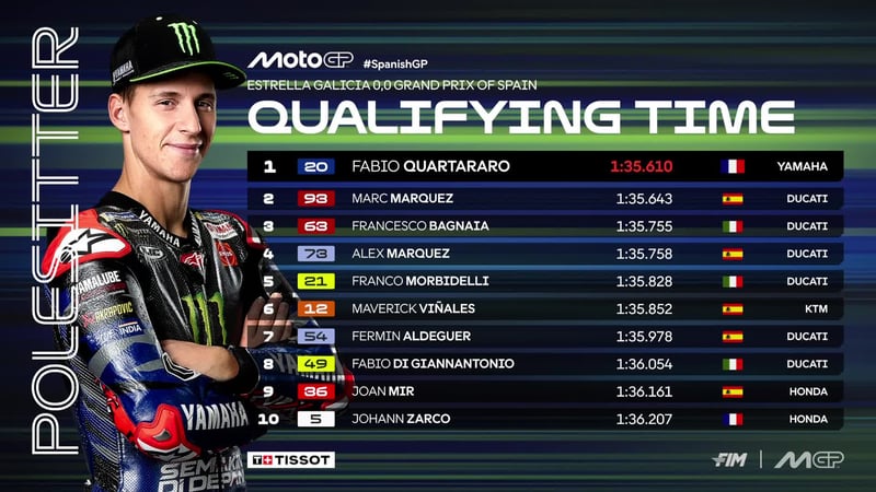 Jerez siempre sorprende a todo el que lo visita. Y en el Gran Premio de España de MotoGP, el francés Fabio Quartararo (Yamaha YZR M 1) ya ha dado la primera campanada al arrebatar al español Marc Márquez (Ducati Desmosedici GP25) la 'pole position' en el circuito 'Ángel Nieto'.