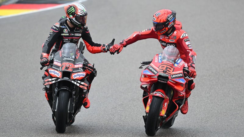 Márquez se ha relajado dos giros, hasta que en el 11º le ha recortado medio segundo a Bezzecchi, dando inicio a una caza que ha culminado en la última vuelta. Tras una lucha cuerpo a cuerpo ha terminando superando al 72, para llegar en solitario a la meta con mucha solvencia. Una victoria que deja claro que es el más fuerte y que en esta pista nadie le puede toser. Además, hay 25 puntos en juego mañana y está en su mano conseguir otro doblete. El podio lo ha cerrado Fabio Quartararo, que ha peleado hasta el final para evitar auge de un Di Giannantonio desbocado al final. Tras ellos, Jack Miller, Brad Binder, Johann Zarco, Alex Márquez y Pedro Acosta, que fueron quienes sumaron puntos, dejando a Pecco Bagnaia en un doloroso 12º puesto.