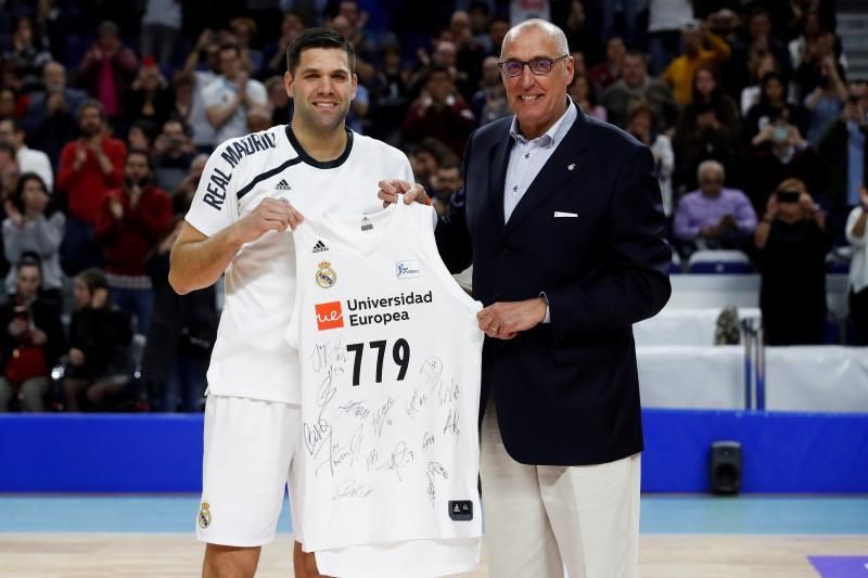 El presidente de la ACB, Antonio Martín, entregó al ala-pívot cordobés un trofeo conmemorativo, mientras que el Real Madrid quiso reconocer su nueva marca personal con una camiseta firmada por sus compañeros, que le fue entregada por el exjugador Rafa Rullán.