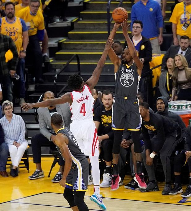 Durant encabezó la lista de los cinco titulares de los Warriors que tuvieron números de dos dígitos, incluido el escolta Klay Thompson, que llegó a los 21 tantos con tres triples y jugó su mejor partido individual en lo que va de la fase final.
