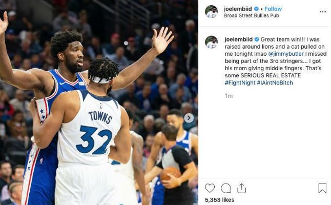 La polémica no terminó con la expulsión de ambos jugadores. Tras el partido, Joel Embiid hizo gestos de boxeador y dirigió gritos a su afición "MVP, MVP" mientras se tomaba la situación como algo cómico. La mofa a Towns prosiguió hasta la rueda de prensa y redes. "No soy una perra. Fui hecho para esta ciudad y ellos fueron hechos para mí. Tienes que ser un matón de Broad Street", dijo tras el partido, y en sus redes sociales también quiso publicar el siguiente mensaje: "¡Gran victoria de equipo! Me criaron alrededor de leones y esta noche un gato tiró de mí".