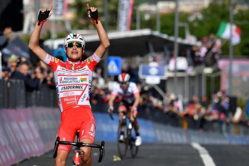 Atacó Rojas a pie de puerto y contestó un joven bergamasco de 25 años, Fausto Masnada (Androni), un escalador ganador de 2 etapas en el reciente Tour de los Alpes, quien avanzó llevándose a rueda a Valerio Conti (UAE).