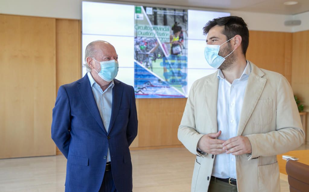El presidente de la Diputación de Sevilla, Fernando Rodríguez Villalobos, y el diputado provincial de Cultura y Ciudadanía, Alejandro Moyano, han presentado este martes el Circuito Provincial de Duatlón y Triatlón 2021, una actividad que no está orientada solo a la competición sino que, como ambos responsables locales han confirmado, "se pone en marcha con un carácter promocional, participativo y de ocio, para deportistas adultos y también para menores, desde los siete años de edad".