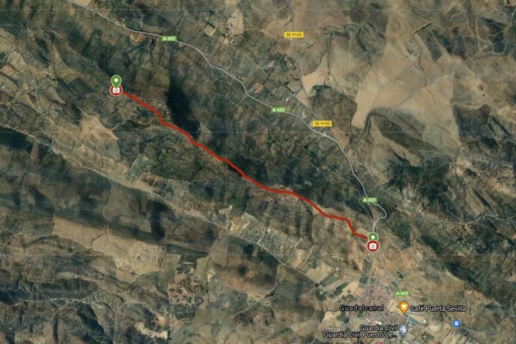 Arranca a pie de la carretera que une Guadalcanal con Valverde de Llerena (Badajoz), frente a la Ermita del Santo Cristo. La pendiente se hace más acusada al inicio del sendero, que parte a 740 m.s.n.m. En todo el camino las vistas son muy amplias llegando a visualizarse tanto la depresión del Guadalquivir (al sur) como la depresión del Guadiana (al norte), divisándose así toda la falda de la Sierra Morena sevillana y todo la campiña sur de Extremadura.