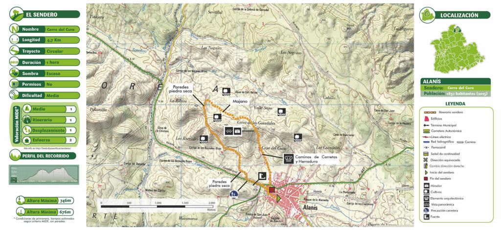 El Cerro del Cura es un sendero circular que discurre al norte de la población, circundando olivares de sierra y encajonado entre paredes de piedra seca. Un camino que permite disfrutar de bonitas vistas panorámicas del casco urbano del municipio de Alanís y de su entorno natural.