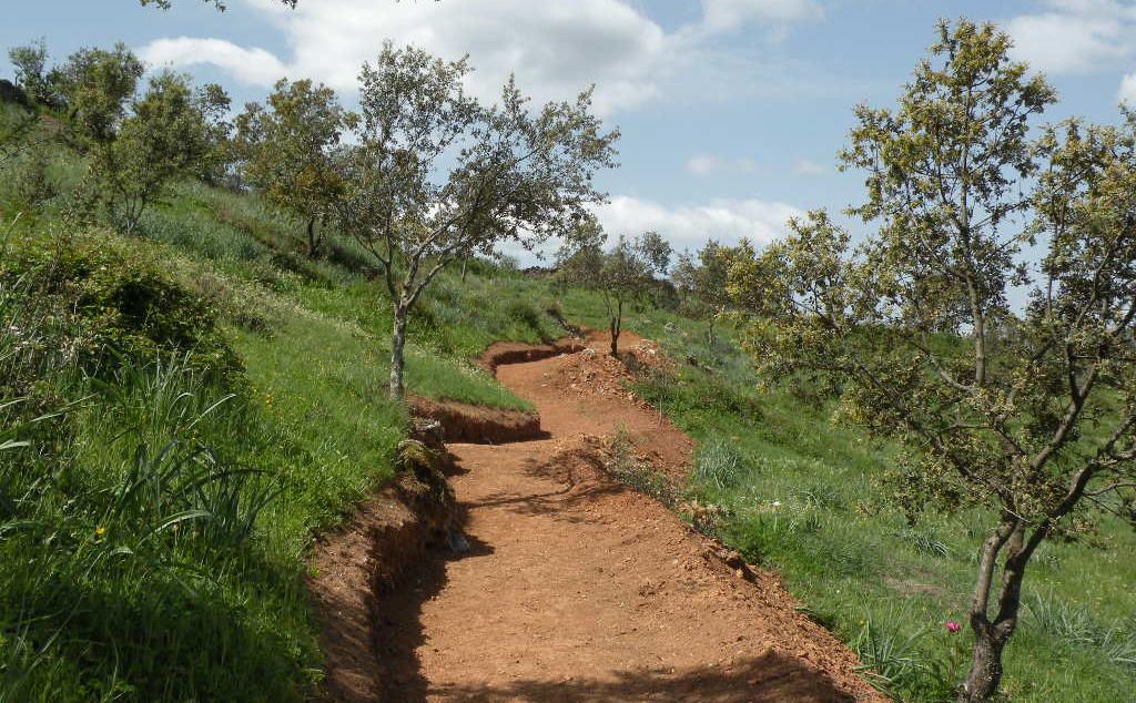 Poco a poco nos alejamos de este bosque para ir ascendiendo por la ladera de uno de los cerros que rodean el noroeste de la población. Paso a paso disfrutamos de un bello paisaje de campos de cultivo y salpicado de encinas en el que también nos encontraremos a la flor del Cuco, de vistósos pétalos de color rojo.