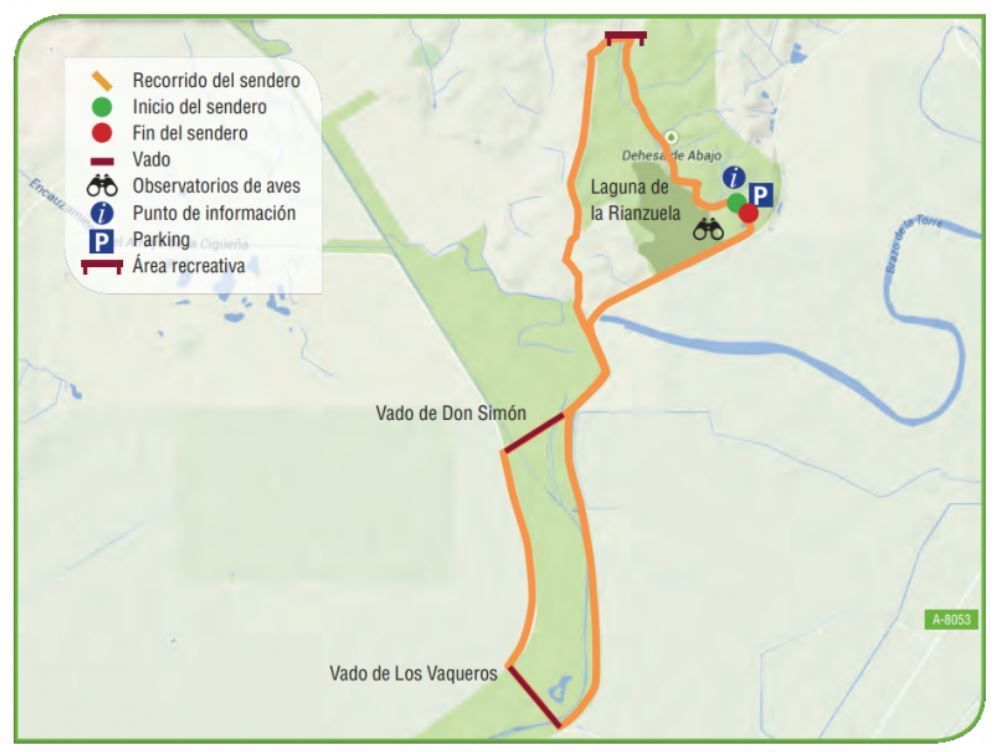 El caminante sale desde el centro de visitantes en busca de la carretera y continuando por la misma hasta llegar al Vado de Don Simón. Sin cruzar, deberá avanzar en paralelo al Caño del Guadiamar, todo recto, hasta llegar a un segundo vado: el de Los Vaqueros.