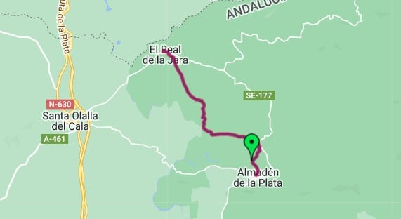 Se sigue el ascenso por esa ruta y en paralelo a una línea de alta tensión. Una bajada más técnica lleva a pasar otra cancela y a salir de los terrenos privados. Cuatro kilómetros por una amplia pista, prácticamente llanos salvo en el tramo final y en las inmediaciones de la dehesa de Robles, llevan hasta El Real de la Jara, último pueblo andaluz de la ruta. Se accede a la localidad por la calle Pablo Picasso, junto al albergue municipal. Los escasos quince kilómetros que se llevan recorridos, aunque de trazado ‘rompepiernas’, plantearán a algunos la continuidad de la etapa hasta Monesterio, distante otros veinte kilómetros.