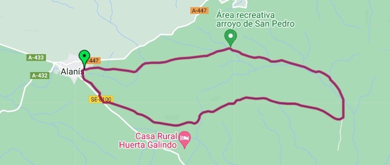 Se continuará hacia la pista forestal en forma circular hacia Alanís, entre parajes de olivos, alcornoques y encinas, dejando atrás una casa rural, hasta llegar al casco urbano de Alanís, donde se pone fin a un recorrido de algo menos de 15 kilómetros que no entraña grandes dificultades en cuanto a desnivel.