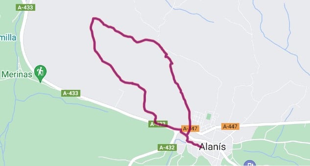 El trazado comienza dentro de la localidad de Alanís para dirigirse al norte del municipio. Todo se inicia circundando olivares de sierra y encajonado entre paredes del sendero "Piedra Seca", en donde nada más empezar nos encontraremos con un punto de agua y habrá que tener cuidado con una carretera. Ese será el que marque la marcha hasta el punto más lejano.