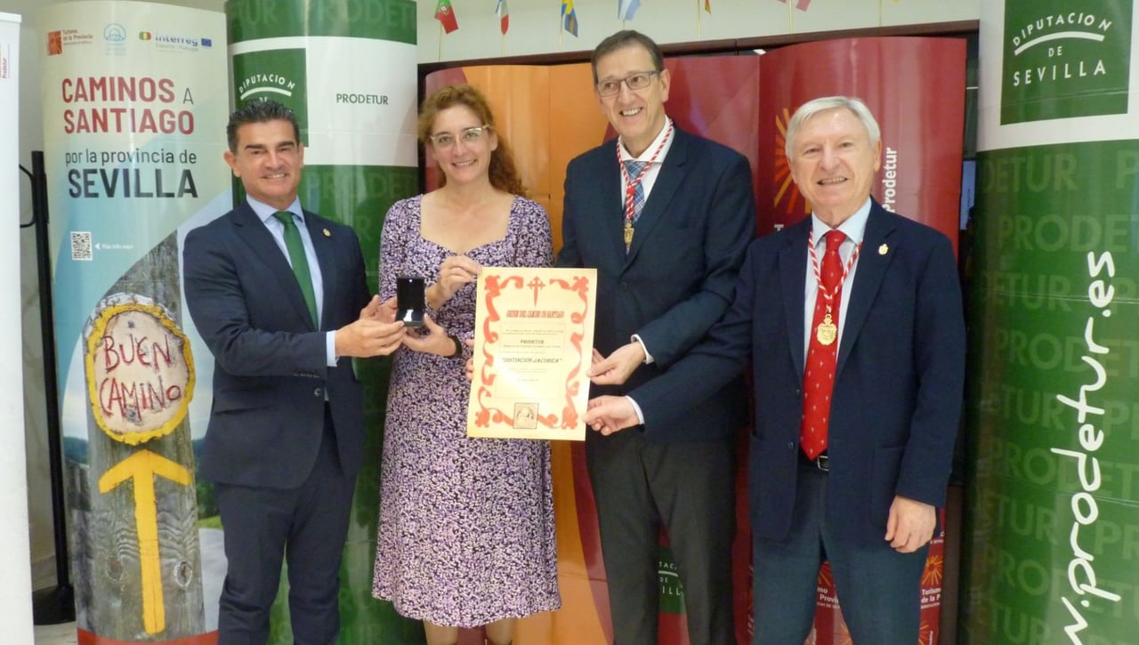 El Gran Mestre de la Orden del Camino de Santiago, Miguel Pampín, y el Canciller de la misma, Alejandro Rubín, han entregado la Distinción Jacobea a Prodetur, como reconocimiento a la labor que esta sociedad provincial, dependiente de la Diputación de Sevilla, realiza en la promoción de las rutas o caminos a Compostela. Este galardón consta de insignia y diploma acreditativo y lo ha recibido la vicepresidenta de Prodetur, Manuela Cabello.