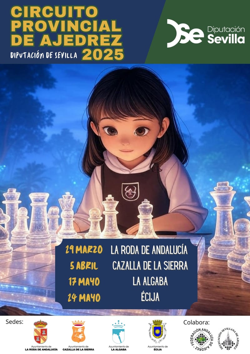 El pasado 24 de Mayo se celebró la última jornada del circuito provincial de ajedrez de Sevilla. El evento empezó a las 09:45 horas y concluyó a las 13:10 horas. Los participantes fueron divididos en 5 torneos dependiendo de su edad, los nacidos en 2017 en adelante estaban en el Torneo 1 los prebenjamines, en el Torneo 2 se encontraban los nacidos en el 2016 y 2015 los benjamines, en el Torneo 3 los que habían nacido en el 2014 y 2013 los alevines, en el Torneo 2 los nacidos en el 2012 y 2011 los infantiles y en el Torneo 1 los que nacieron en 2010 y 2009 los cadetes.